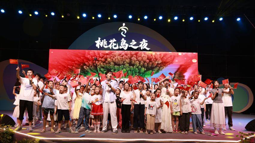 “少年智则国智,少年自由则国自由……”伴随铿锵音乐,华中师范大学“爱心托管班”师生携手洋坪镇芭芒店托管班志愿者同台献演《雄狮少年》,醒狮腾跃、少年齐唱,瞬间点燃全场。随后,12个节目轮番登台,舞蹈、合唱、说唱、古筝弹唱等多元形式交织,将“青春、志愿、家乡”主题诠释得淋漓尽致。最后,当熟悉的旋律《我和我的祖国》响起,全体演出人员手持五星红旗上台齐唱,400余人同声高歌,桃花岛瞬间化作红色海洋,歌声响彻沮水两岸。