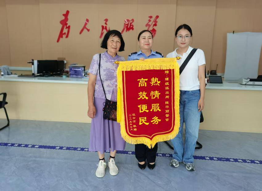 5天办结,群众送锦旗致谢 7月21日,汪训芬的户口补录申请顺利通过审批。当拿到崭新的户口本时,她激动不已,连连向民警道谢。 第二天,汪训芬的女儿、女婿一家专程来到派出所,送上了一面鲜红的锦旗,上面写着:“热情服务 高效便民”。女儿握着民警的手说:“你们的办事效率太高了,太感谢了!”