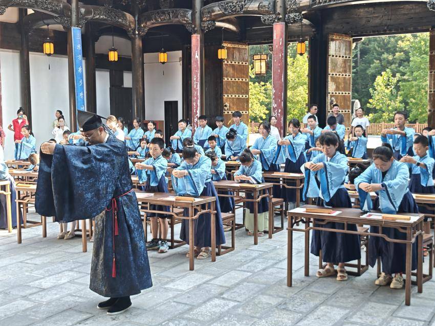 湖北日报客户端讯(通讯员黄钰溶)7月28日,花林寺镇暑期爱心托管班联合龙仰书院为五十余名儿童精心打造了一场别开生面的传统文化实践课。孩子们身着传统学子服,开启“晨至暮归”的沉浸式体验,在书院完成从“正冠启智”到“薪火相传”的穿越之旅,亲身触摸中华传统文化的千年脉动。
