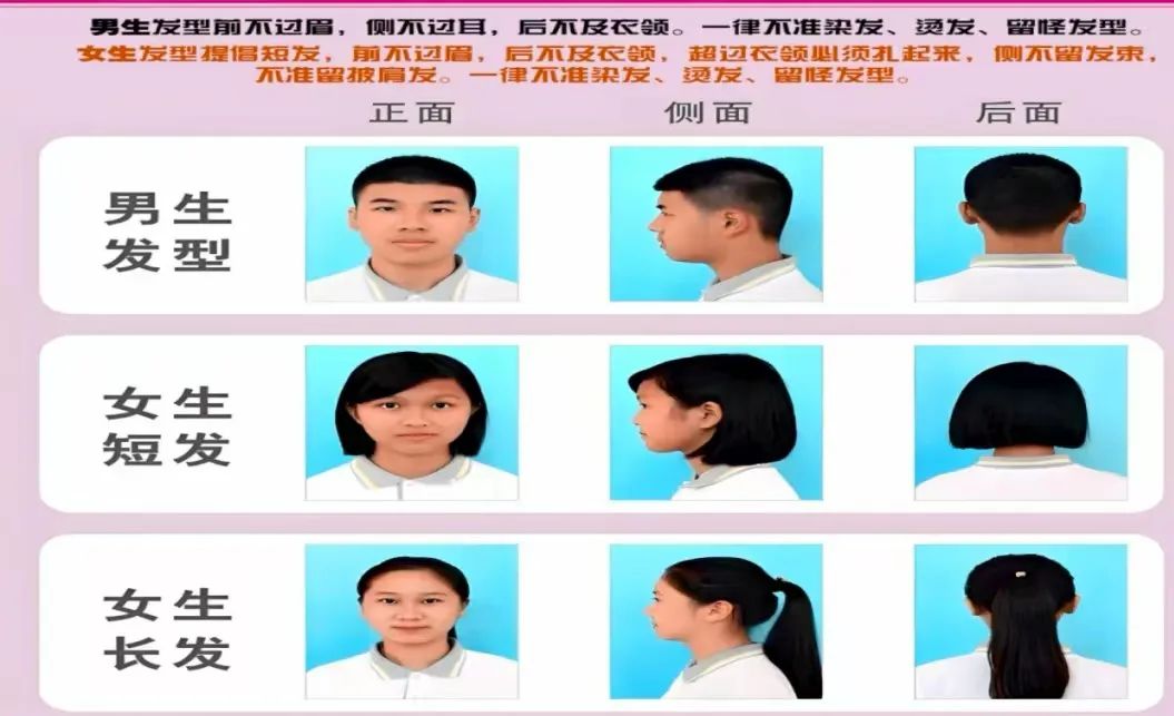 3.仪容仪表须符合《中学生日常行为规范》基本要求,学校对学生仪容仪表有严格要求:穿戴整洁、朴素大方,不穿奇装异服,言谈举止文明得体;男生禁止留长发,前不及眉、侧不掩耳、后不盖领;女生短发或扎马尾,不披发。男女生都不允许烫发、染发、留怪发,不化妆,不得佩戴戒指、耳环、项链等饰物。