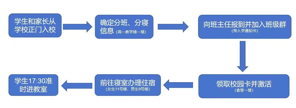 1.8月22日8:30—17:00到高一教学楼一楼大厅查看分班、分寝情况,凭入学通知书到对应班级找班主任报到,加入班级官方群;