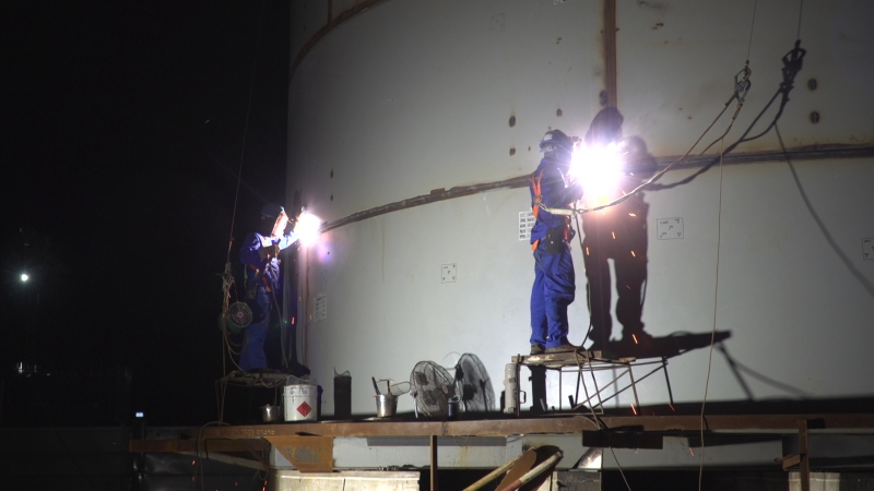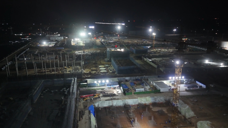 夜幕降临,施工现场探照灯光照亮全场,电焊火花在黑夜中闪烁,工人们或立于高台焊接、或专注于钢筋绑扎,现场仍是一派热火朝天施工景象。