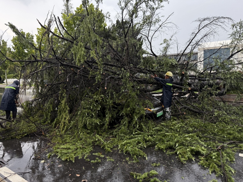 暴雨肆虐间,当阳市财政局门前路段出现紧急状况。路边一棵松树被大风刮倒,正好砸中一辆正在行驶的车辆,车内人员被困,情况危急。此时,当阳市农村经营管理局工作人员梁志强听到从车内传来的呼救声,没有丝毫犹豫,立刻冒着暴雨冲上前去。他迅速清理压盖车门的树枝,成功救出被困群众。梁志强是一名共产党员,也是一名退役军人。在群众面临危急时刻,他挺身而出、果断施救,用实际行动诠释了“退役不褪色”的使命与担当,展现了共产党员的先锋本色。随后,当阳市住建局的工作人员迅速来到现场进行清理工作,他们拿着电锯将枝丫切割,用吊车将枝干抬起,让车辆迅速脱困。