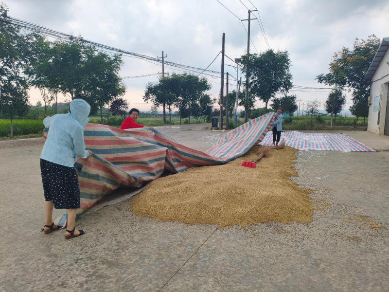 在坝陵街道黄林村也有暖心事件发生,村干部李凤琼、唐菲菲,途经宗海水稻专业合作社仓库门口晒谷区域时,天气骤变,看着村民独自忙着抢收晒场粮食,她们当即停下脚步,加入抢收队伍。消息传开,周边邻里也纷纷自发赶来,众人迅速分工,有的协助收拢彩条布,有的合力归拢粮食,在降雨前,高效完成抢收,守护住劳动成果。