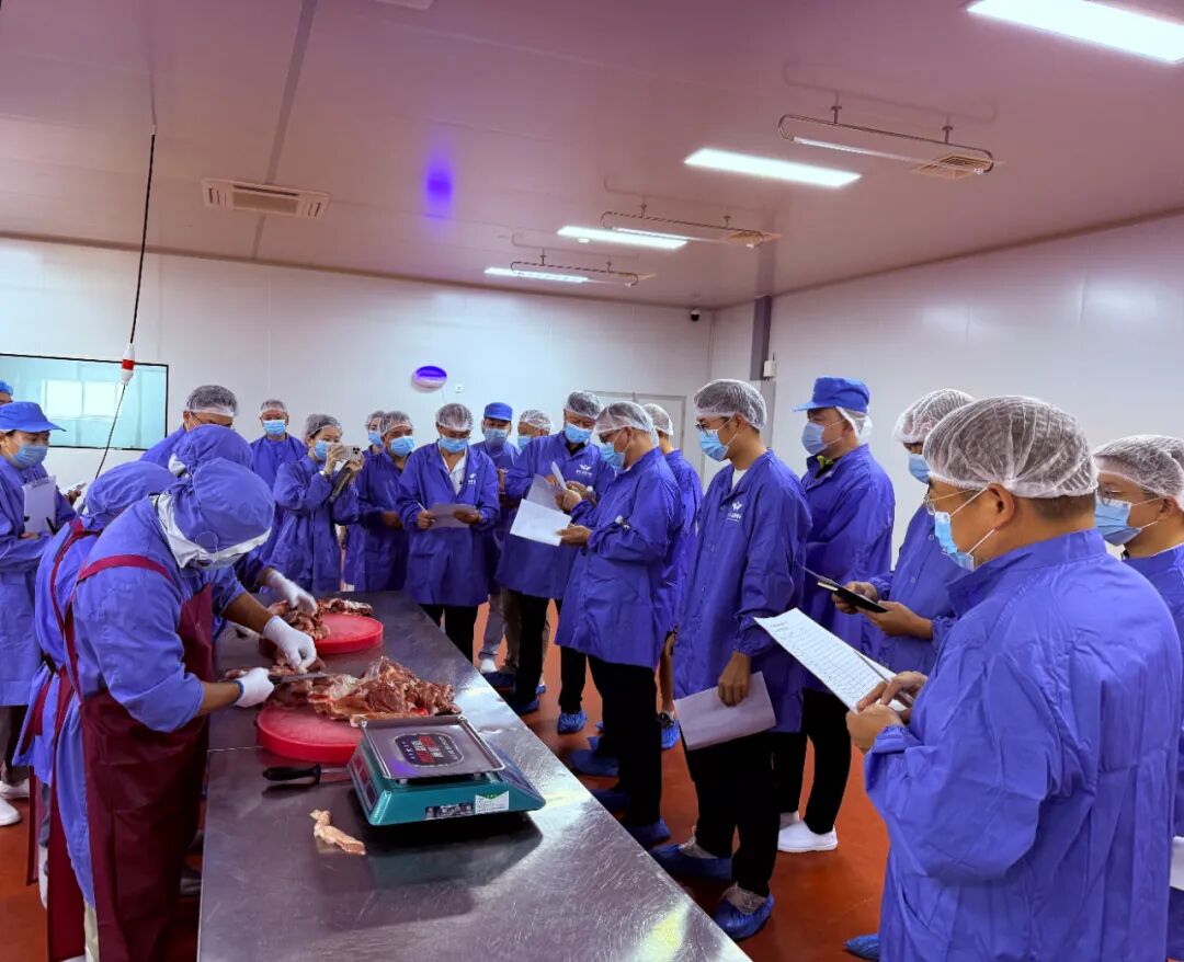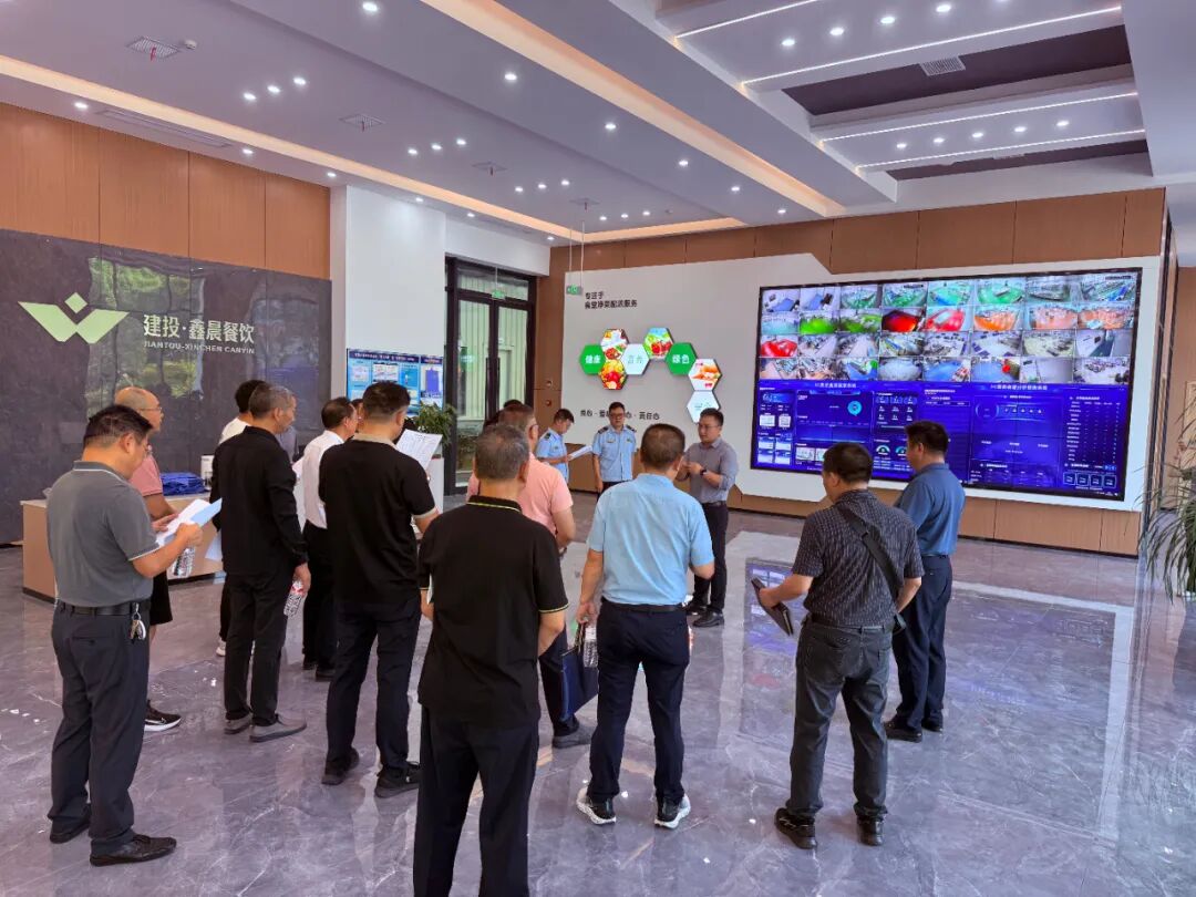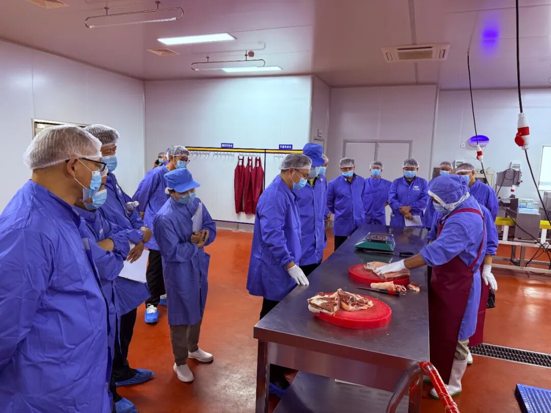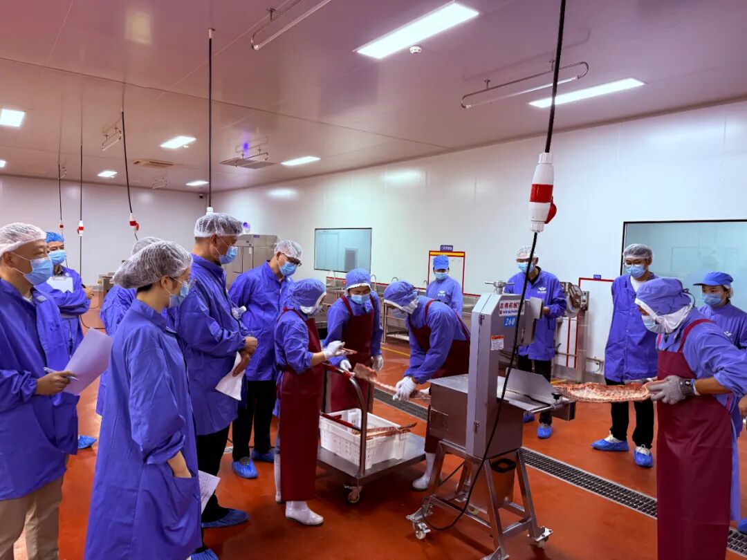 鑫晨餐饮公司首先介绍了产品加工流程,随后同与会代表进入生产车间进行实地考察。在肉类加工间和蔬菜加工间,代表们现场观摩了食材的分割、切配与称重过程,并对净料加工数据进行了详细记录与复核。