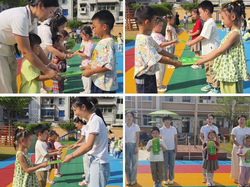 随后的班牌交接环节,中大班幼儿双手捧着班牌,郑重地交到小班弟弟妹妹手中,象征着成长的传承。