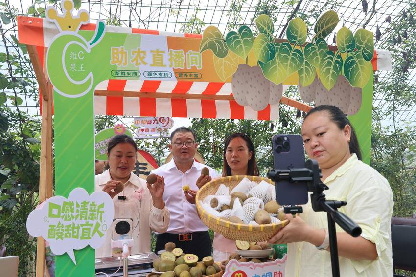 “给大家近距离瞅瞅,咱们的果子皮薄肉厚,个顶个的胖娃娃,小果鸡蛋大小,中果80-90g,现摘现发。”果园直播摊位前,“鹿村长”付炜炜一边称重,一边利落地切开一颗红心猕猴桃,给了手机前的网友们一个“特写镜头”。