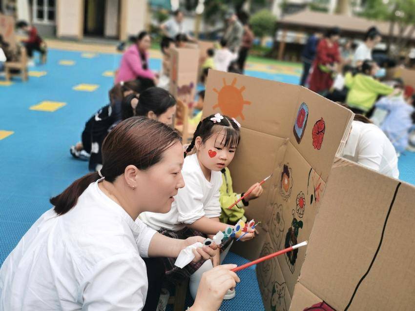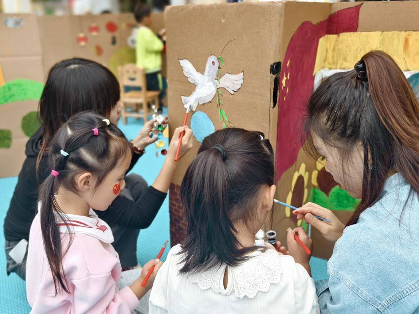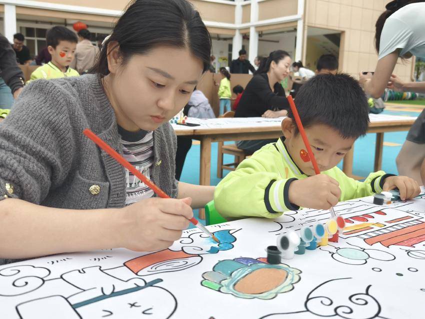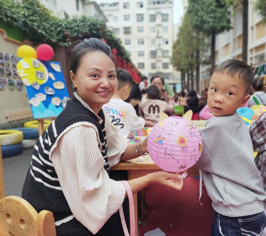 亲子创作环节更是亮点纷呈,大班组亲子纸板手绘,用画笔勾勒出中秋皓月与飘扬国旗交相辉映的美好画面;中班组亲子共涂鸦百米画卷,以斑斓色彩描绘“中秋遇国庆”的喜庆场景;小班幼儿则在家长协助下发挥奇思妙想,制作出造型各异、创意十足的灯笼。孩子们在亲身体验中不仅锻炼了动手能力,更直观感受了传统文化的独特魅力。