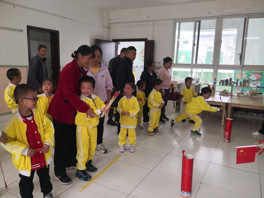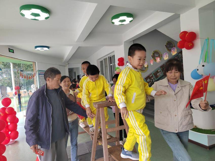 精彩表演后,丰富的亲子互动环节正式开启。“中秋灯谜爱国答”吸引众多家庭参与,“圆圆的,甜甜的,中秋吃”“红颜色,五颗星,祖国的象征”等趣味谜题,让孩子在猜谜过程中加深对双节的认知。“投壶雅趣”考验着孩子的手眼协调能力,“团圆拼图乐”则让亲子在协作拼搭国旗、月亮图案的过程中,体会团圆与爱国的意义;“重走长征路”活动通过木梯、木板、轮胎搭建的模拟路线,让孩子在家长的带领下,手持小国旗体验长征艰辛,传承红色精神。