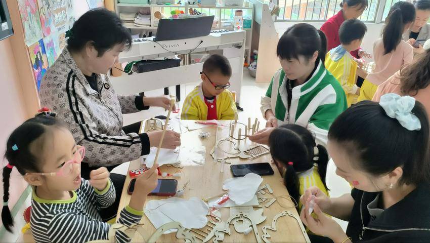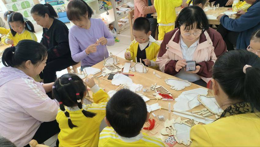 活动室里,家长与孩子默契配合,涂颜料、粘框架、装灯串,一个个色彩鲜艳、充满童趣的玉兔灯笼逐渐成型,现场满是温馨的亲子时光。