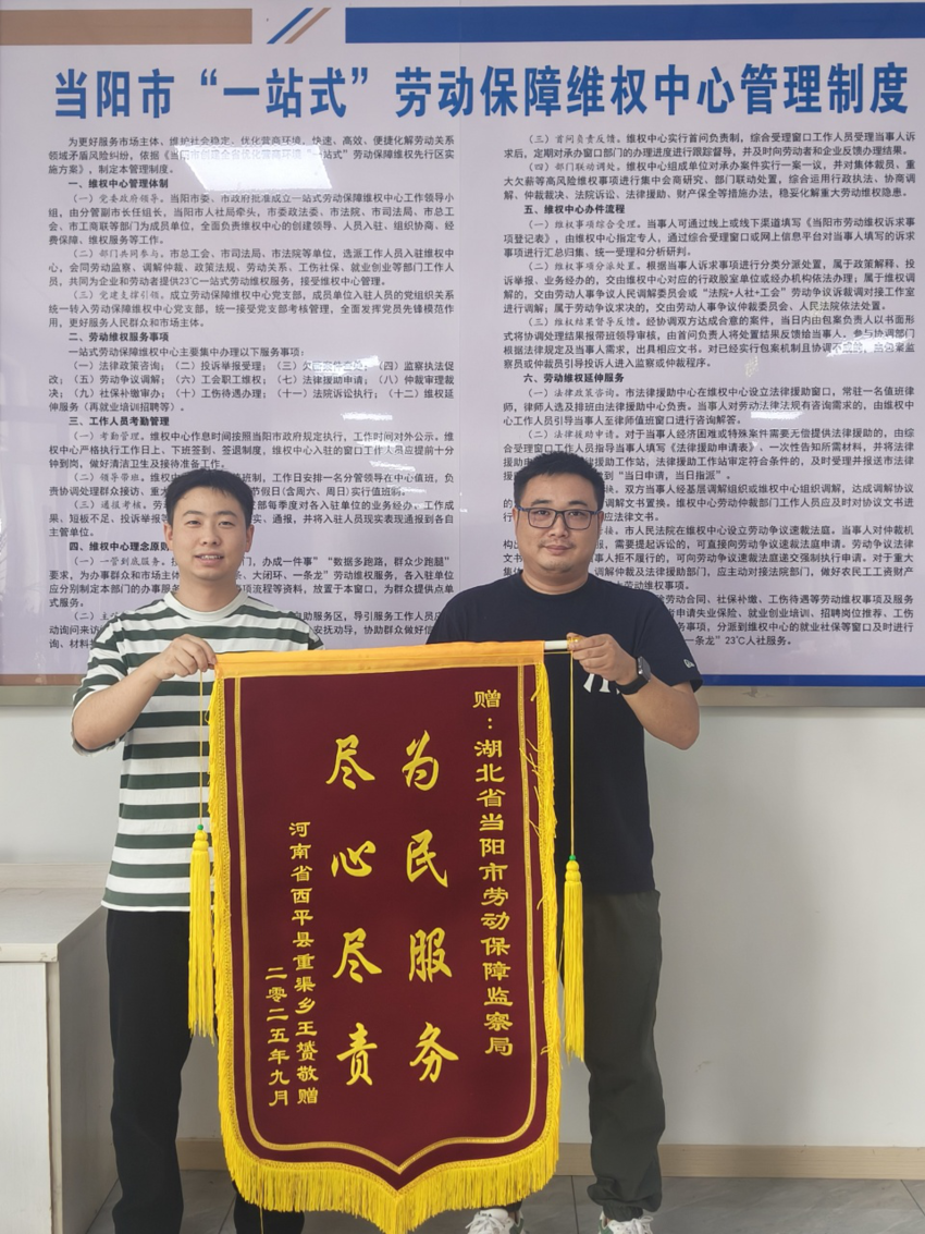 湖北日报客户端讯(通讯员 郭子贤)近日,当阳市劳动维权中心收到一份从河南寄来的特殊快递。打开包裹,一面印有“为民服务,尽心尽责”金色大字的锦旗徐徐展开,无声地诉说着一段为异地务工人员成功维权的暖心经历。