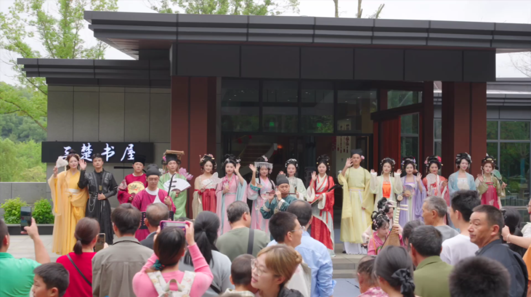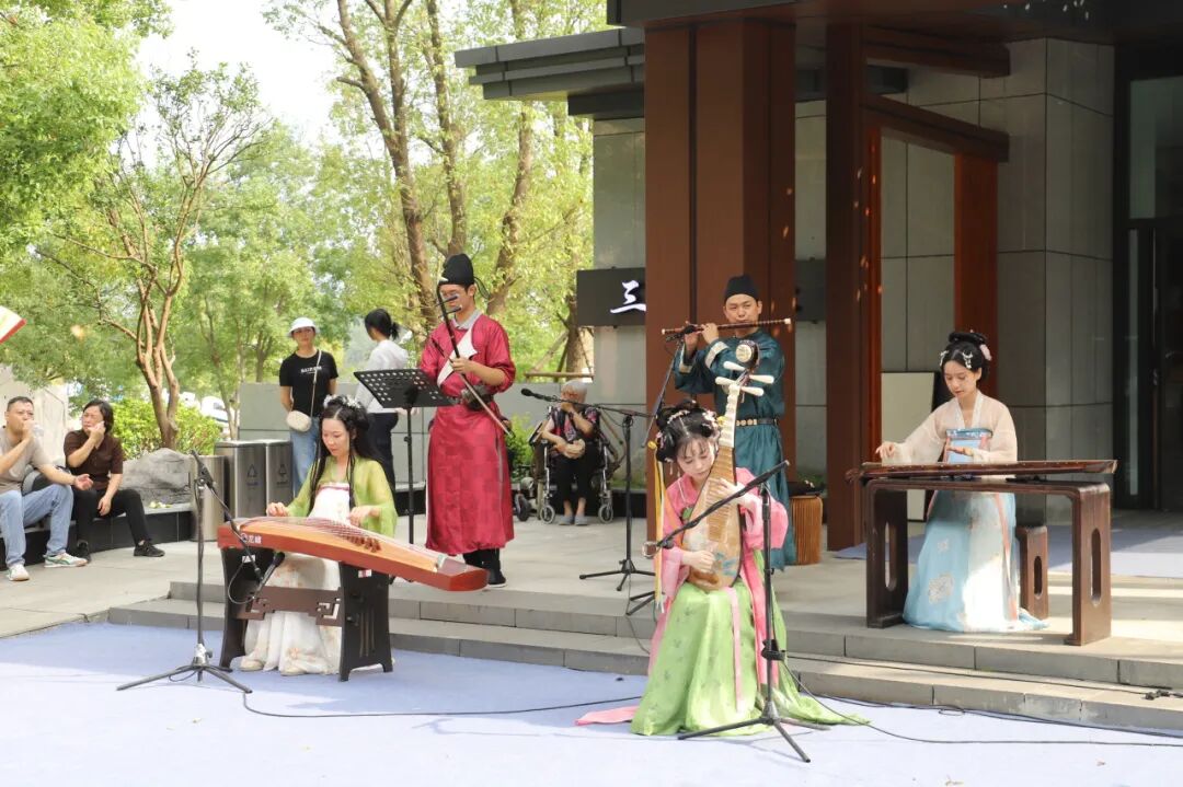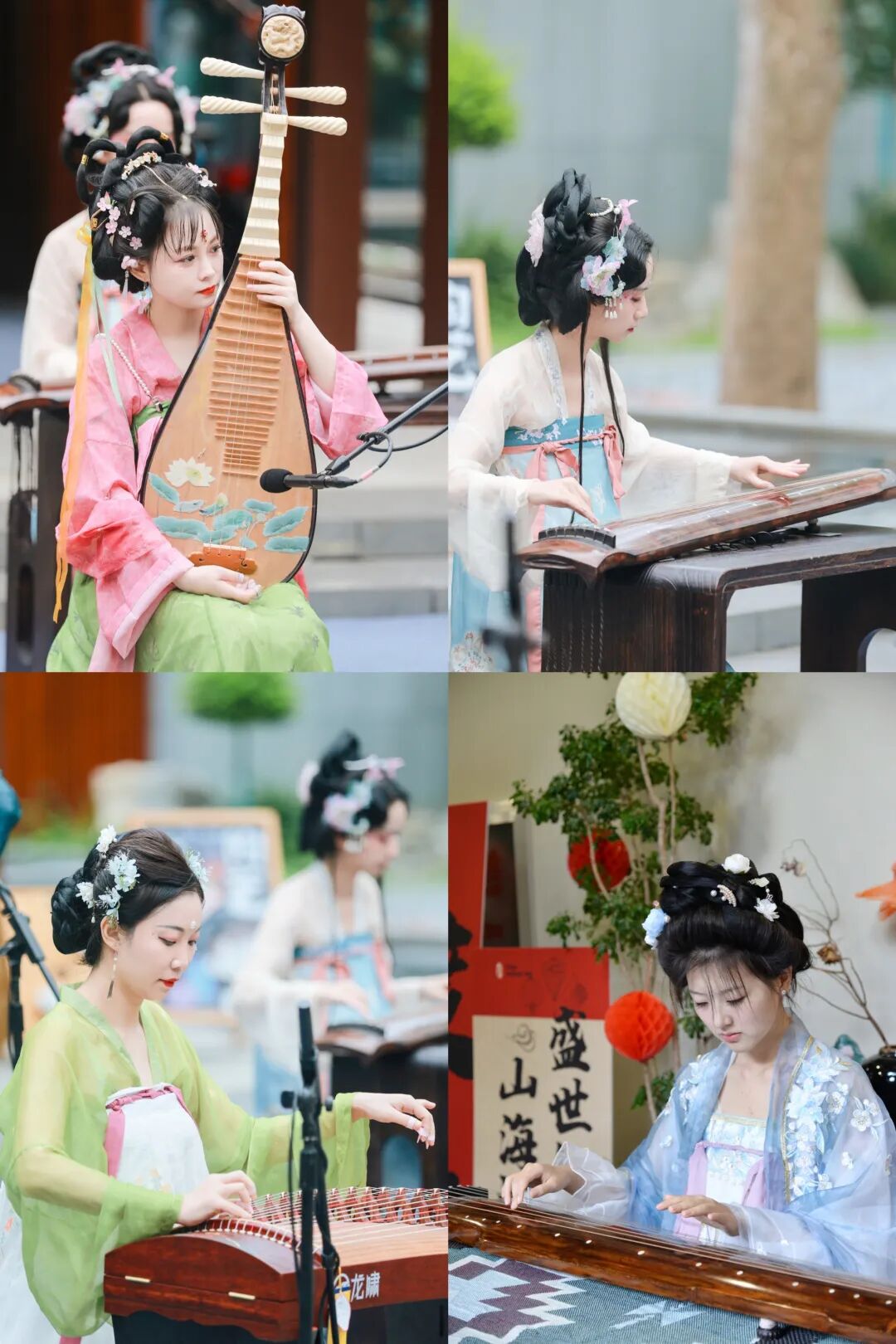 身着汉服的NPC在景区巡游,与游客互动合影,重现三国风雅;三楚书屋前,古筝、古琴、二胡等民乐表演轮番上演,悠扬婉转的旋律与古寺、银杏相映成趣,游客们驻足聆听,沉浸在音乐和书海的雅致意境中;铁塔广场上,古彩戏法大师的表演引得阵阵惊呼,卖货郎小丑则穿梭在人群中派发小礼物,与孩子们互动逗乐,现场气氛十分热烈。