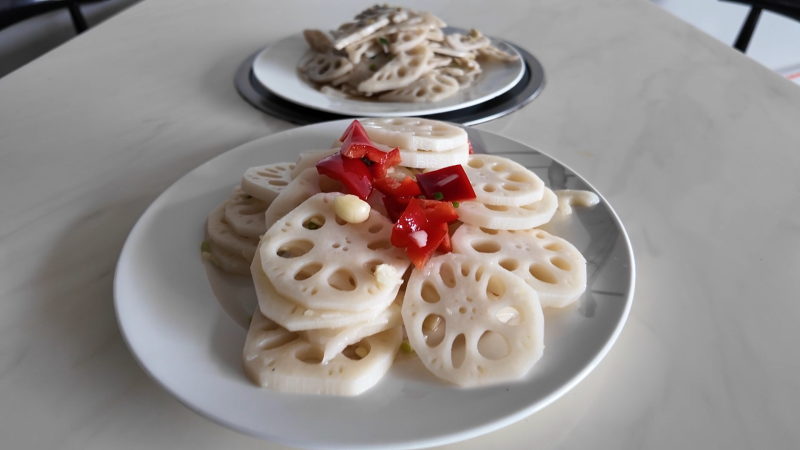 糜城藕不仅可以做成脆嫩爽口的滑藕片,新鲜糜城藕还能做凉拌藕片。将滑藕片与凉拌藕片端上桌,浓郁的香气便四散开来。即便经热油翻炒,滑藕片仍透着雪白色泽,格外诱人。