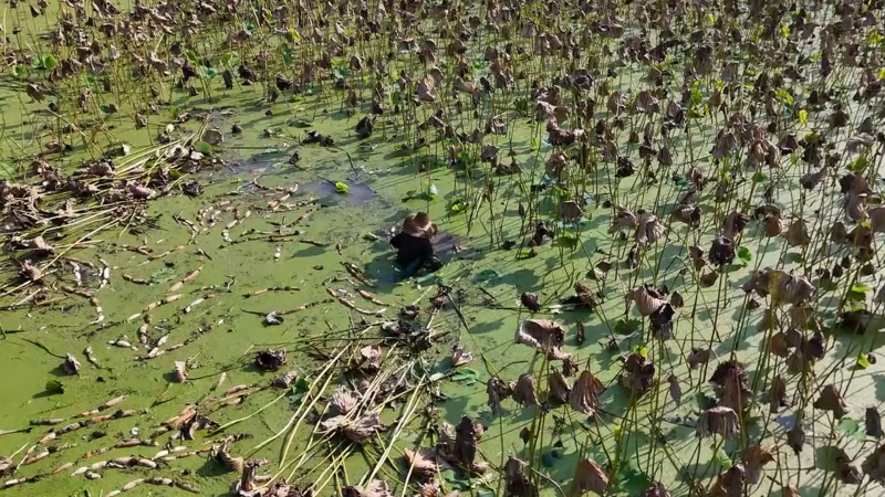 偌大的藕塘里荷叶田田。藕农邓家艮半隐荷叶中,一手持高压水枪冲开淤泥,一手在塘中小心摸索。不多时,一节节饱满的糜城藕便浮出水面。