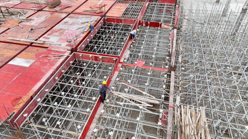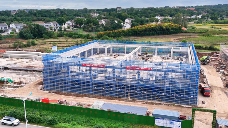 项目现场,施工井然有序,工人们正在进行厂房主体结构的施工作业。