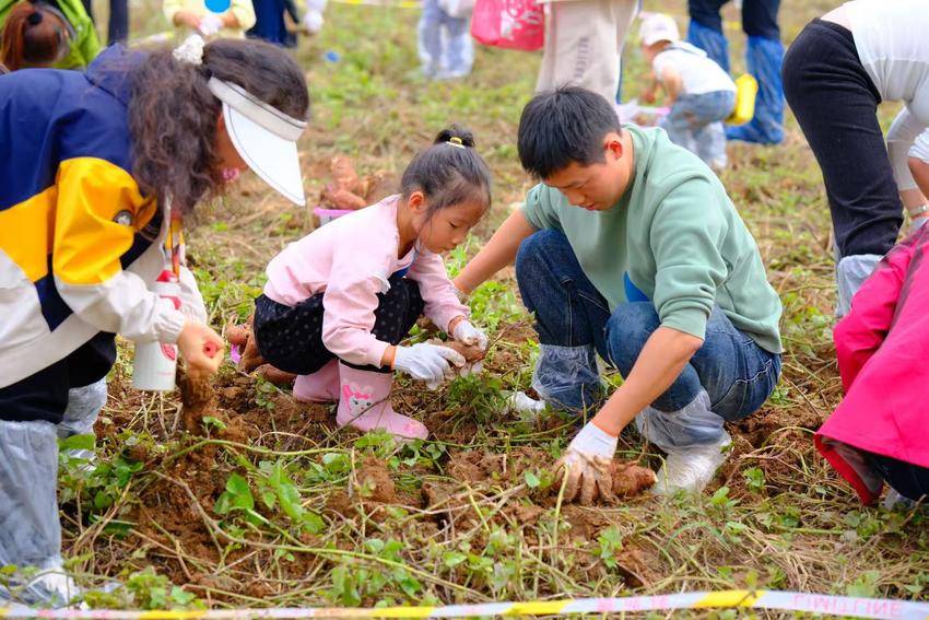 除了美食,活动还设置了多项互动体验环节,让游客深度参与其中。“挖宝趣味赛”上,大人小孩手持工具钻进红薯地,亲手挖掘新鲜红薯,体验劳作的乐趣;“割稻谷”现场,游客们在志愿者的指导下,拿起镰刀感受传统农耕文化,沉浸式体验丰收的不易与喜悦。此外,活动现场还搭建了“田野直播间”,通过网络直播向网友展示红薯丰收景象、特色农产品及精彩活动瞬间,进一步扩大了新店村红薯产业的知名度与影响力。
