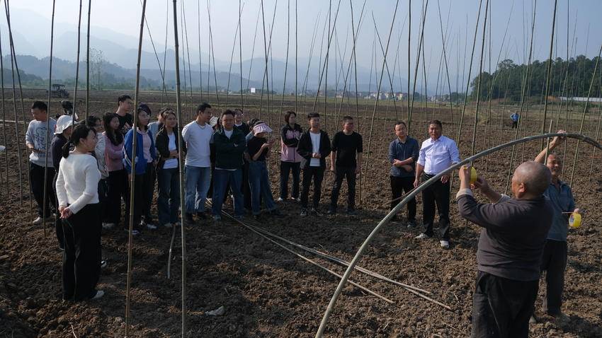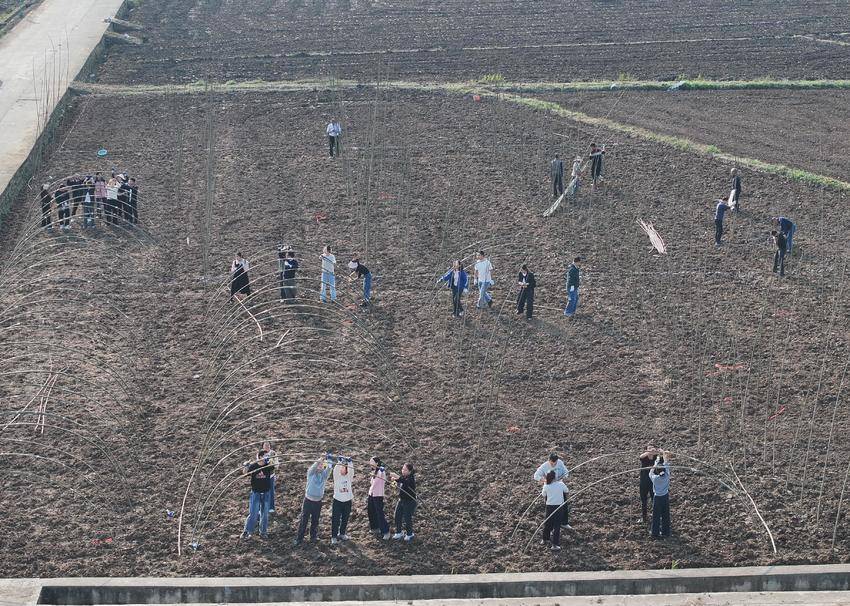 在基地负责人的详细介绍下,干部们了解了羊肚菌的生长特性与棚架搭建要领。作为喜湿耐寒的珍稀食用菌,羊肚菌对种植环境要求严苛,棚架搭建直接关系到温湿度控制与产出效益。随后,干部们分组动手实践,在农技人员的现场指导下,从定位、立杆到固定,一步步将理论知识转化为实操技能,顺利完成多个棚架的搭建任务。