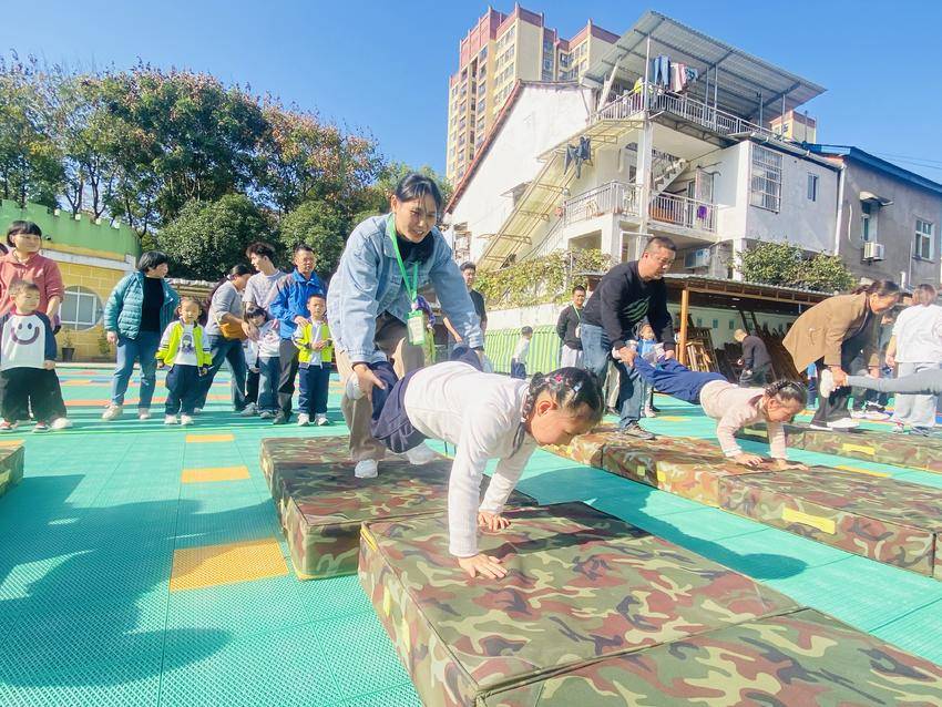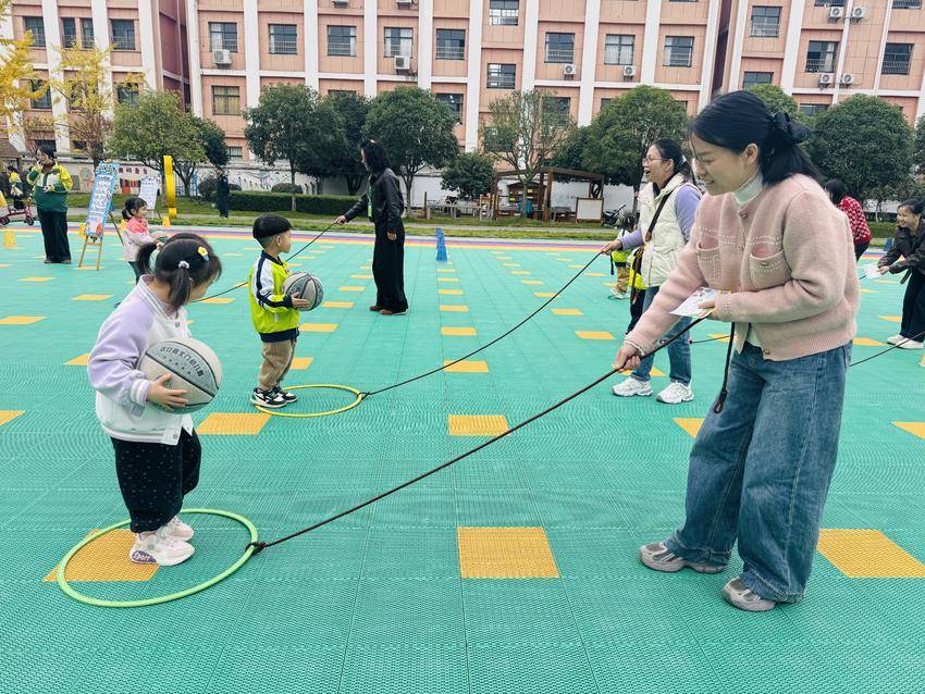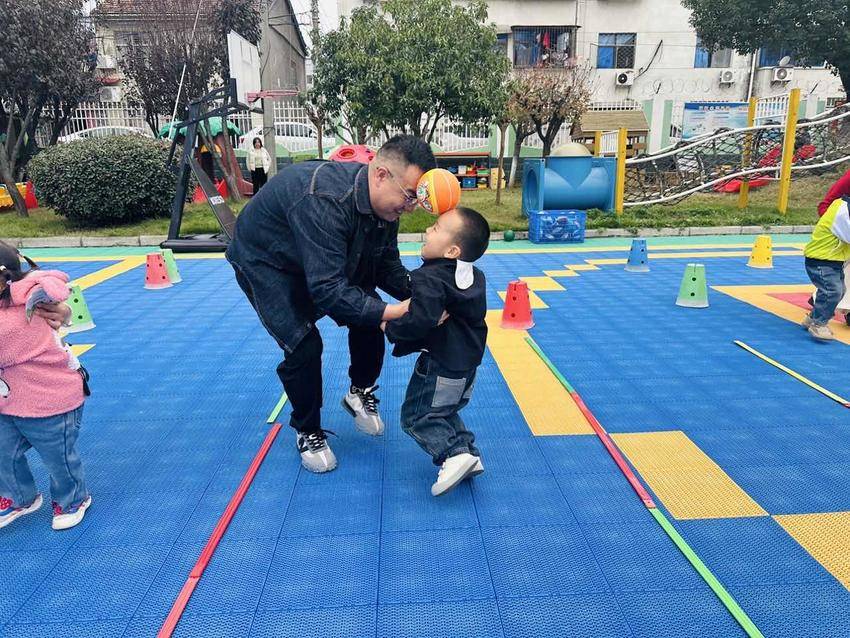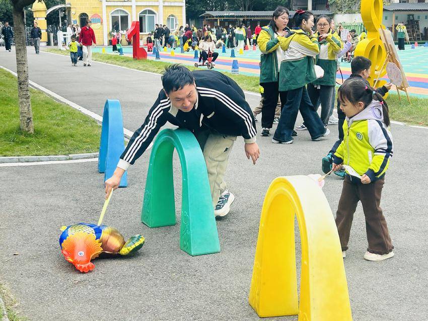 开幕式结束后,亲子游园运动会正式开启。小中班组以游园式体验为主,“小兔拔萝卜”“亲子运球”“障碍接力”等趣味游戏点位前排起了长队:在“小兔拔萝卜”游戏中,家长弯腰当“桥墩”,孩子踩着家长的腿跨过“小河”去拔“萝卜”,成功后亲子相拥的瞬间满是欢喜;完成游戏后,老师会在孩子的游戏卡上盖一个卡通印章,孩子们攥着卡片认真数着印章,当集齐6枚印章时,则会激动地向家长炫耀。
