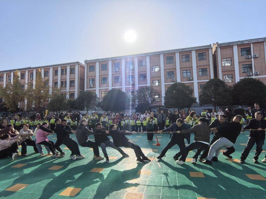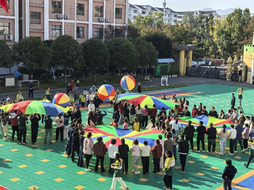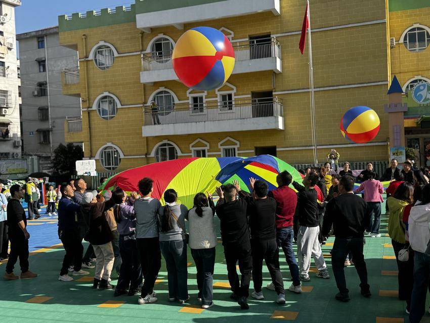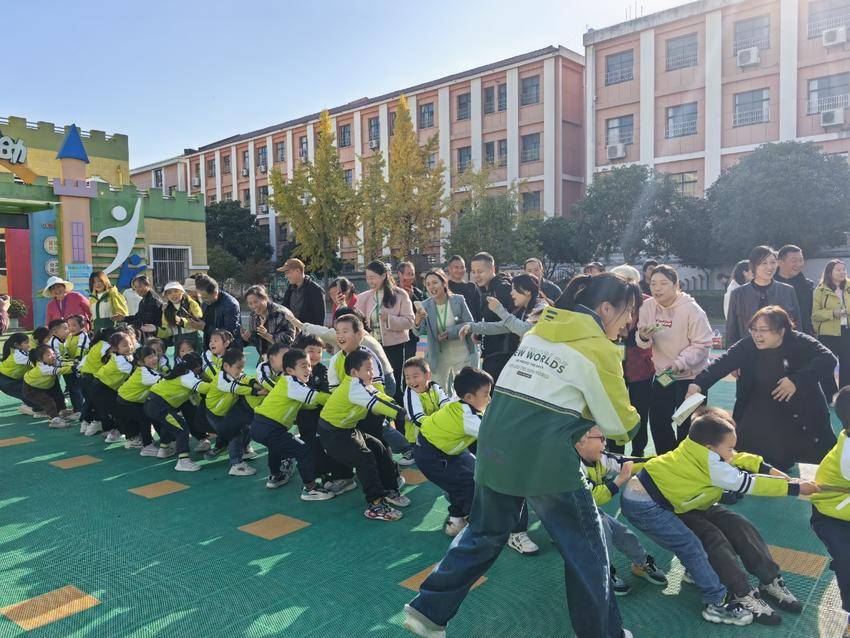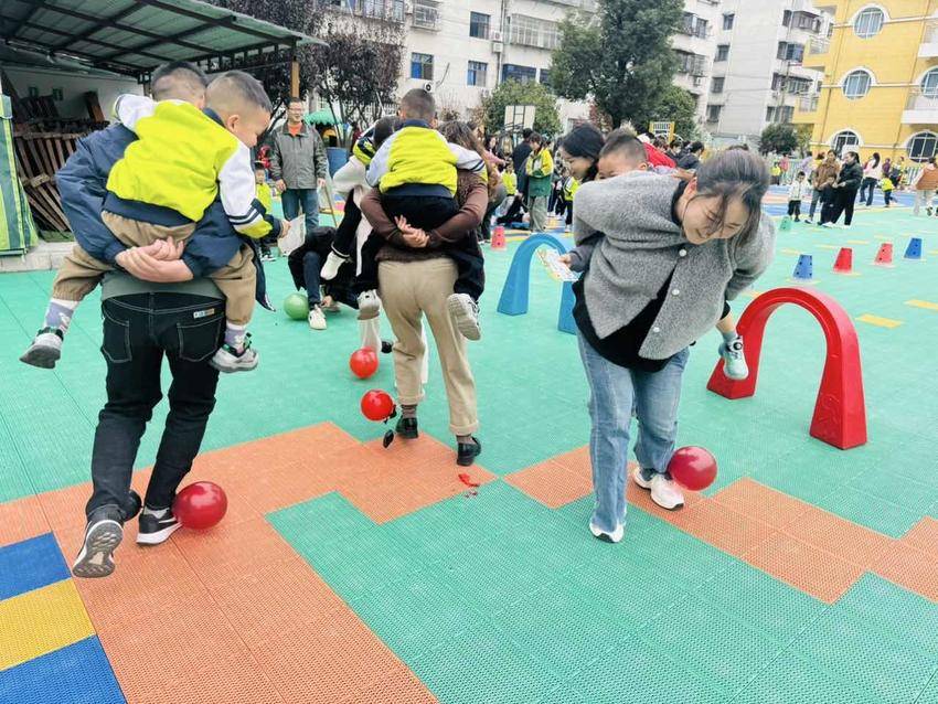 大班组的活动则兼顾竞技与趣味。首先,亲子共跳的热身操点燃了现场活力,家长们跟着孩子的节奏蹦跳,脸上满是笑意,随后,拔河比赛和彩球弹弹乐两项集体项目精彩上演。亲子拔河比赛瞬间把欢乐氛围拉满,家长们紧握绳子往后拉,为了荣誉拼尽了全力,孩子们也充满了集体荣誉感,小手紧拽着绳子,使尽全力不肯认输,场外“加油”声震耳欲聋;彩球弹弹乐游戏中,家长手抓彩虹伞边缘,合力将彩球弹起又接住,彩色的伞面与家长的笑脸相映成趣,集体游戏让大朋友和小朋友都收获了满满的欢乐。随后,大班组家庭转入游园体验——亲子竞技游戏大闯关。赛场上,家长们化身成孩子的“最佳队友”,全身心投入这场充满爱与挑战的协作之旅。游戏中,家长们始终耐心引导,或俯身帮孩子调整姿势,或轻声喊着节奏口号同步动作,更会用眼神给予孩子坚定的鼓励;孩子们则紧紧跟上家长的步伐,亲子间的默契在一次次配合中自然流露。比赛结束后,为鼓励孩子们的运动精神,园方还特意为幼儿园每组家庭准备了一份小小的礼物。