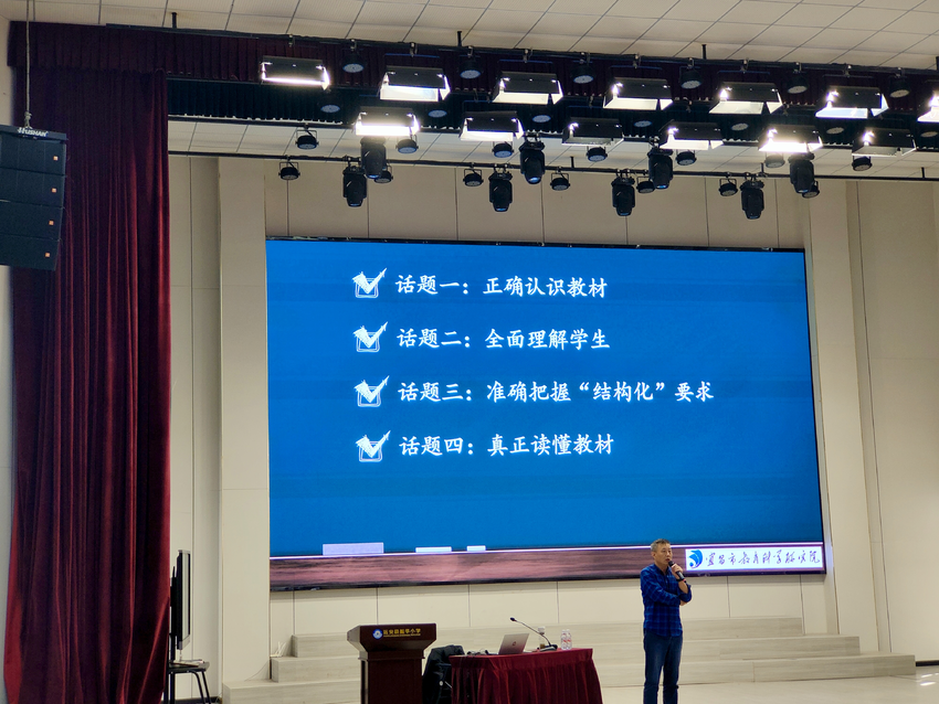 13日下午,我们有幸聆听了宜昌市小学数学教研员罗善彪老师的专题讲座《小学数学核心素养导向的课堂转型实践》,罗老师对这次课堂进行了高屋建瓴的指导,分别从正确认识教材、全面理解学生、准确把握“结构化”要求和真正读懂教材四个话题进行阐述,让我们对如何挖掘新教材、怎样启发学生思维有了更为深刻的思考。