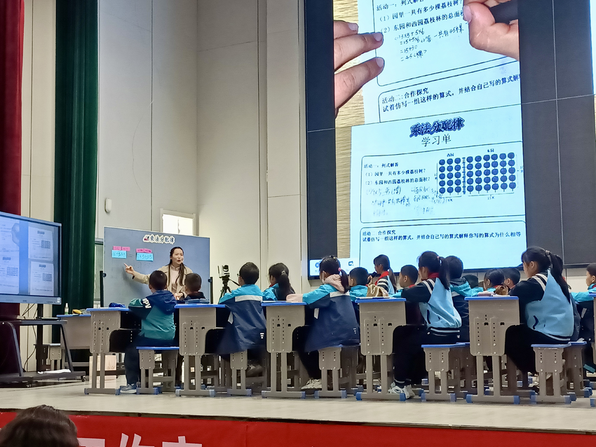 12日上午,陈春妮名师工作室联合县内陈秀丽小学数学工作室、车玉洁小学数学教学评一致性行动研究工作室及远安县小学四年级数学教师,围绕《乘法分配律》第一课时开展线下线上融合集备,老师们以校为单位做好前期课时内容研究、现场提出备课建议和问题,在长达两个小时的思维碰撞后确定教案,并由邹语老师试教。当日下午,参会教师针对试教课进行了二次交流和修改,为第二天的正式授课做足准备。 13日,陈春妮宜昌名师工作室代表和远安县小学数学教师代表在振华小学报告厅进行了课堂教学展示,一场课堂教学盛宴拉开帷幕。 上午,远安县栖凤小学温晴青老师、夷陵区东城小学戴奥老师、远安县振华小学邹语老师、宜都实验小学胡开敏老师依次进行了《乘法分配律》的同课异构课堂,他们依据课标制定教学目标,巧妙设计教学活动,引导学生在课堂上深入体验知识生成过程,新课标对学生主体地位的要求得到充分落实,同时学生的思维状态得到全面呈现。