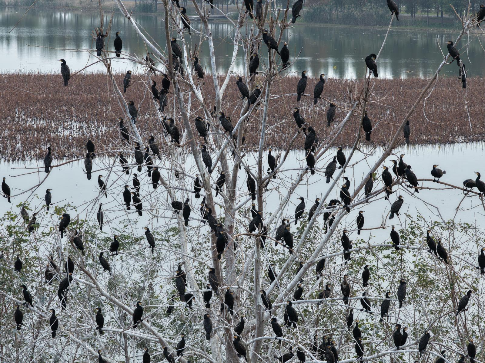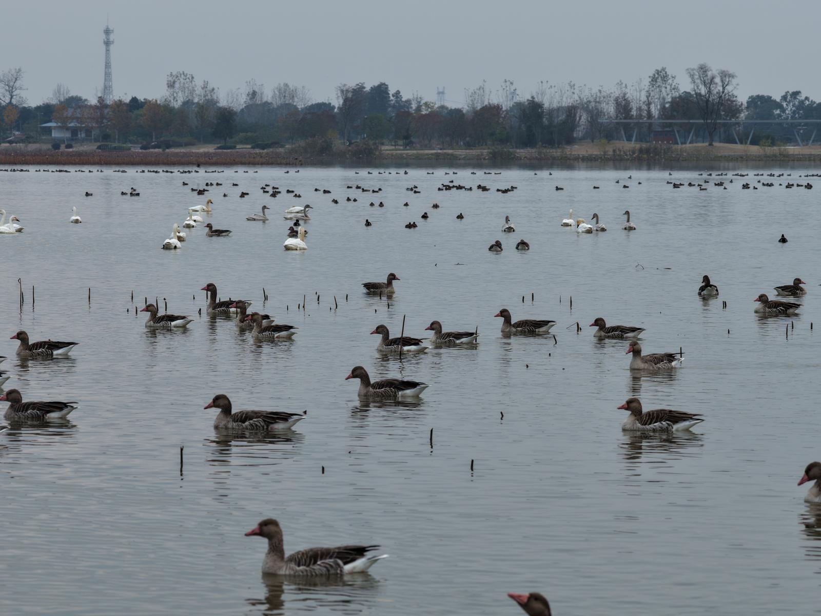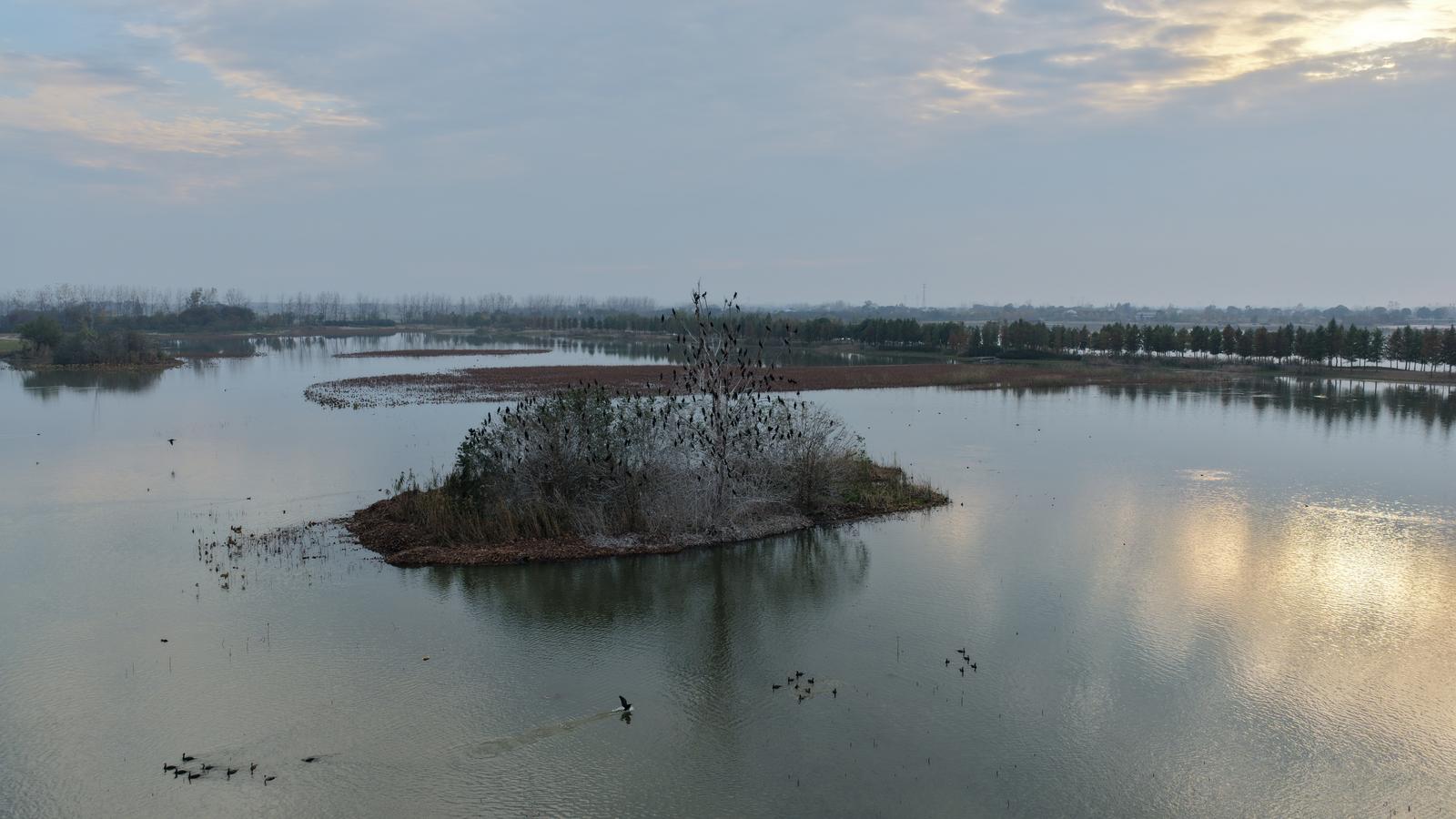 11月23日,记者在当阳季家湖国家湿地公园看到,湖面如镜,倒映着成群候鸟翩跹的身影。上百只鸬鹚密集栖于湖心岛一棵杨树上,蔚为壮观;数十只小天鹅连续六年如约而至,白鹤、灰雁、凤头潜鸭等候鸟纷至沓来,将这片2340亩的水域点缀成灵动的“天鹅湖”。