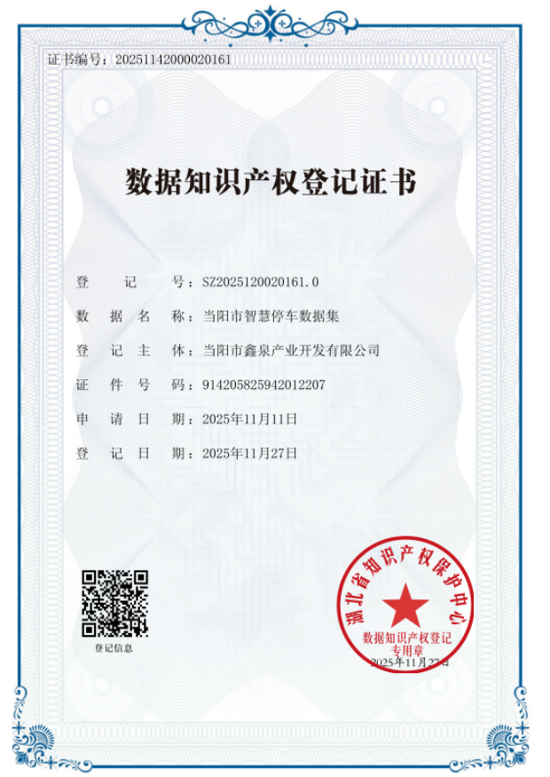 湖北日报客户端(通讯员 肖芳)近日,由当阳市鑫泉产业开发有限公司运营的“当阳市智慧停车数据集”正式完成数据知识产权登记,成为该市首件获得官方保护的数据知识产权。