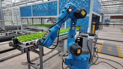 除了“空中草莓”外,园区水培生产种植也充满现代农业技术。不仅全部采用无土化栽培,且种植全流程由机器人进行操控,通过智能系统对室温、阳光、水量等进行调节,避免病虫害的影响,保障产品质量,提升种植效率。“我们的水培生菜,它的空间利用率很高,一年可以种12茬,陆地的话一年只能种3茬。主要销往北京、上海、广东,我们的合作商有盒马生鲜等大型商超,还有海底捞等知名餐饮品牌。”王雪红说。