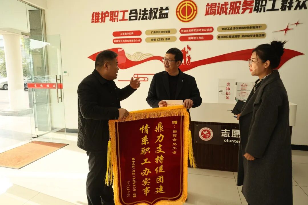 “真的太感谢你们了!多亏了你们的鼎力支持,我们的劳动竞赛和红色教育活动才能如此顺利!”12月3日,蒙牛乳业(当阳)有限责任公司相关负责人来到当阳市总工会综合服务大厅,将一面写有“鼎力支持促团建、情系职工办实事”的锦旗交到当阳市总工会负责人手中,言语中充满感激。