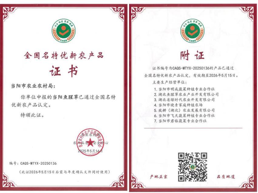 湖北日报客户端讯(通讯员 蒋思源 )今年五月,当阳市农业领域迎来喜讯——经国家相关部门严格评审,“当阳鱼腥草”获得“全国名特优新农产品”认定称号。这标志着当阳在推进特色农业品牌化、优质化发展道路上取得了重要突破,为地方农业产业注入新动力。