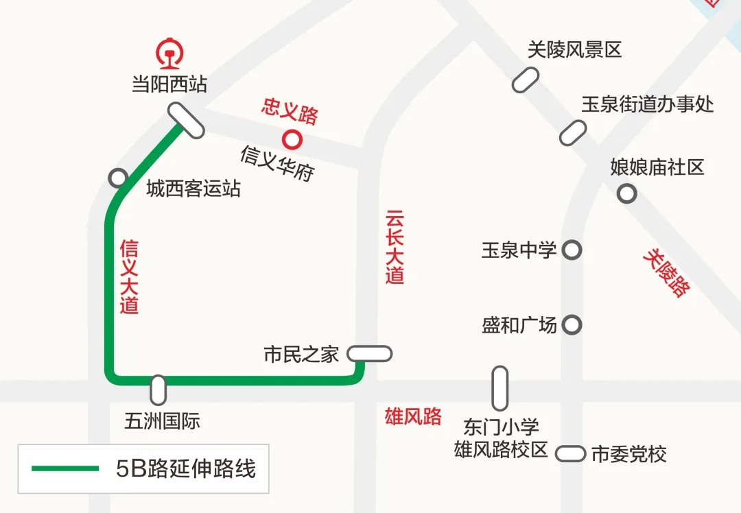 5B将原始发站市民之家延伸至当阳西站,经停市民之家—五洲国际—当阳西站