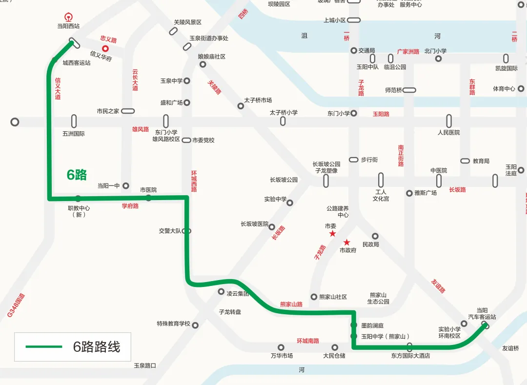6路起点为当阳西站,终点为汽车客运站,具体线路为:当阳西站—职教中心(新)—当阳市医院雄风院区—疾控中心—关公文化小镇—交警大队—襄西革命烈士陵园—龙城帝景—墨韵澜庭—当阳市玉阳中学(熊家山)—东方国际大酒店—汽车客运站(具体发班时间根据高铁到、发车时间实行动态调整)