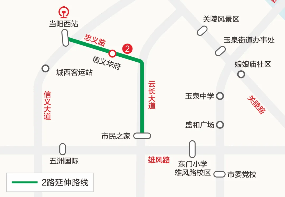 2路将原始发站市民之家延伸至当阳西站,经停市民之家—信义华府—当阳西站