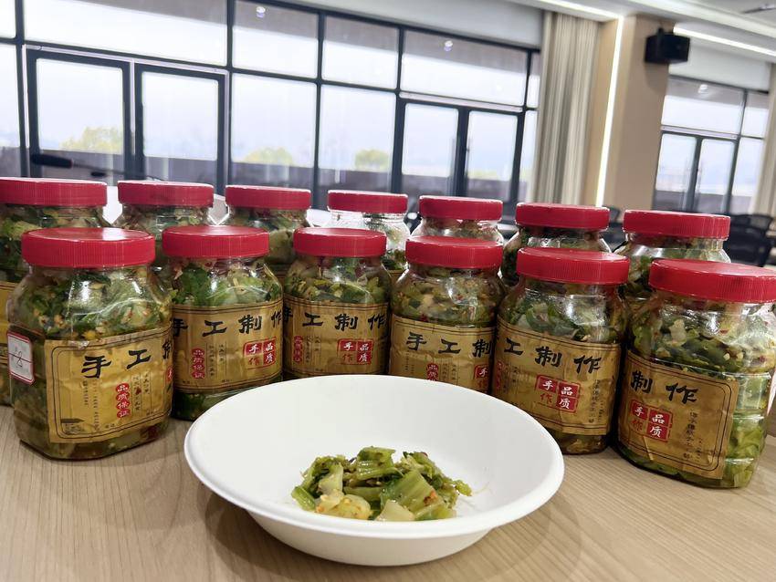 活动现场氛围热烈。柴火大灶蒸汽升腾,青翠鲜嫩的青腊菜经过清洗、切碎,整齐码放。随着村党支部书记黄维华宣布比赛开始,参赛村民迅速投入制作:烫菜、调味、装瓶等,动作娴熟流畅。不一会儿,一瓶瓶黄绿相间、冲香扑鼻的冲菜便整齐排列在展示台上。在随后的品鉴环节中,四位评委依据“色、香、味”标准进行综合评定,最终评选出前三名“冲菜制作达人”并现场颁奖。
