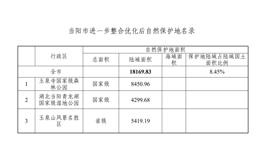 二、进一步整合优化后,当阳市自然保护地总数量3处,面积共18169.83公顷,分别为当阳玉泉山风景名胜区、青龙湖国家级湿地公园、玉泉寺国家级森林公园。当阳玉泉山风景名胜区为省级风景名胜区,面积5419.19公顷;青龙湖国家级湿地公园为国家级湿地公园,面积4299.68公顷;玉泉寺国家级森林公园为国家级森林公园,面积8450.96公顷。
