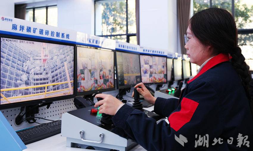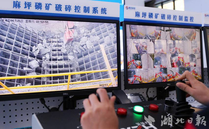 杜东南是麻坪磷矿破碎控制中心的一名操作工人,他轻握手柄,操作指令瞬间传至5公里外的井下,2号溜井卸矿口的破碎锤应声启动,大块的矿石瞬间掉落到了溜井里。杜东南坦言:“采矿工作就像‘打游戏’一样,轻松、高效、安全!”