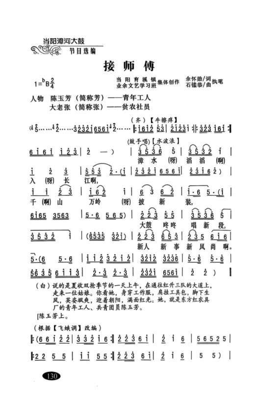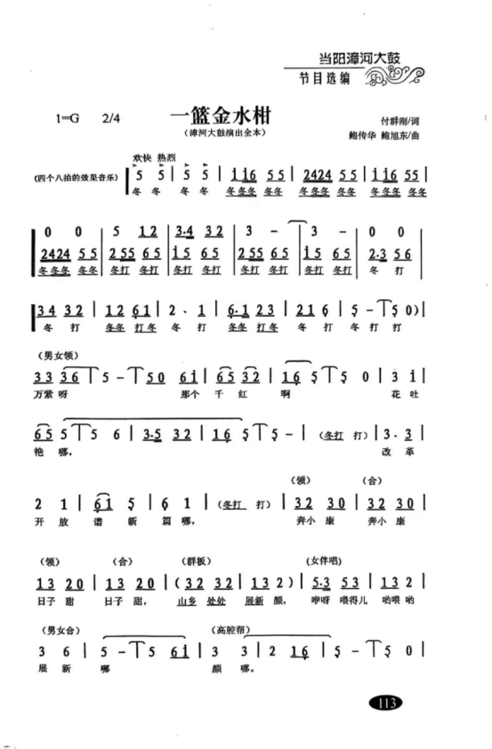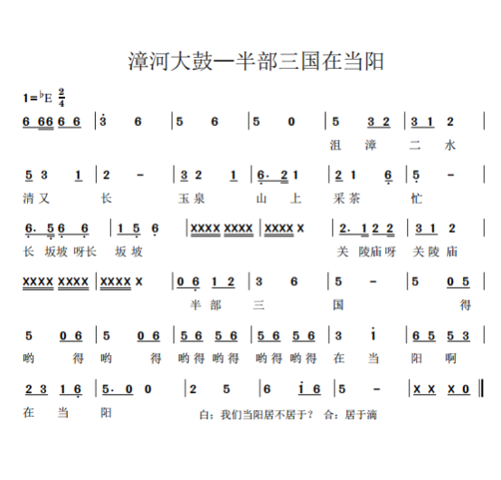 以上例子,可以看出当阳漳河大鼓自诞生以来,从老中青文艺工作者石鉴恭、余怀勋、鲍传华、鲍旭东、卢必武、罗卫华、罗江云等代代相传,漳河大鼓的基本调式没有大的变化,这也正是漳河大鼓的根脉所在。 三、倚声填词的具体要求 漳河大鼓平腔调式填词方法比较简单,一般以七言四句较多,也可以七言六句、八句,根据剧情需要可以反复吟唱。现以七言四句为例。 (一)字数 七言四句即每句7个字,共4句,如: “鸦雀子加几加耶,老鸹哇几哇耶,人嘎的女婿多么大,我的女婿一滴尕”(京山民歌《小女婿》)。 又如:“漳水滔滔入长江,千山万岭披新装。大鼓咚咚唱新段,新人新事新风尚”(漳河大鼓《接师傅》) 又如:“万紫千红花吐艳,改革开放谱新篇。奔小康日子甜,山乡处处展新颜。”(漳河大鼓《一篮金水柑》) 曲艺创作每句7个字,字数要求并非一成不变,其中会有一些语气词“啊、呀、耶、呃”等进行填充或辅助,更具口语化和泥土气息。 (二)押韵 与戏曲唱词一样,曲艺唱词也要押韵,漳河大鼓平腔调式押韵可平仄通押。对于小型剧目来说,通常一韵到底会更好,演唱者更加朗朗上口。当然,由于剧情需要,不同唱段的换韵现象也是存在的。针对曲艺也有专门的韵书,可以参看元曲《中原音韵》或者中华书局编的《中华新韵》。 (三)声调与音高当阳方言属于西南官话,其声调系统与普通话有相似之处,但具体调值存在差异。普通话有四个声调(阴平、阳平、上声、去声),当阳方言也通常分为四类声调,但每个声调的实际音高轮廓(调值)可能不同。例如,古入声字在当阳方言中的发音与普通话有所区别,如“吃”在当阳方言中可能发音为[q],这反映了声调和声母的特殊变化,每个声调的音高走向可以对应到音乐旋律的音高变化。阴平(第一声,高平调):音高而平,如“妈(mā)”。在乐谱上,通常对应一个相对较高且平稳的音,例如保持在高音区的长音。阳平(第二声,升调):音高从中音升到高音,如“麻(má)”。旋律上常表现为向上行的音程,或保持在较高音区。 上声(第三声,降升调):音高先降后升(在实际语流中常简化为低降),如“马(mǎ)”。旋律处理较复杂,可对应先下后上的音型,或一个较低、有沉降感的音,有时为旋律流畅会做变通。 去声(第四声,降调):音高从高到低,如“骂(mà)”。在乐谱上通常对应向下行的音程。 轻声:短而轻,无固定调值,随前字声调变化,旋律上常表现为短促、弱音或音高不突出的音。 这种对应基于汉字声调具有区别意义的功能。如果旋律音高与字调不匹配,可能导致听感别扭或字词听错。 (四)语言风格 作为地方曲艺,漳河大鼓的语言风格,更倾向于用乡间俚语、地方方言,更口语化,仿佛就是隔壁邻居在说话、父老乡亲在对答。同时也要注意,乡土气并不代表庸俗,一些方言中带贬损辱骂、甚至低级下流的话,是要摒弃的。曲艺创作永远要保持积极健康向上、风趣幽默生动的初心不变。 四、创作示例。 现创作一段《半部三国在当阳》,抛砖引玉,与热爱漳河大鼓的朋友们共勉。 “沮漳二水清又长,玉泉山上采茶忙。长坂坡关陵庙,半部三国在当阳。” (漳河大鼓《半部三国在当阳》2025年罗卫华曲)