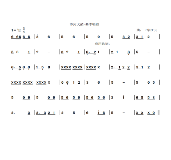 一、漳河大鼓的基本调式——平腔 漳河大鼓的曲谱调式可分为平腔、怒腔(武腔)、悲腔、喜腔四个唱腔,其中以平腔为基本调式,其他三个腔,都是在平腔基础上,由演唱者加以情绪的把控:节奏欢快、兴高采烈,就是喜腔;节奏缓慢、伤心难过,如泣如诉就成悲腔;节奏明快、情绪高昂,就是怒腔(武腔)。在平时一些小型创作中,掌握平腔的基本调式,填写七言四句、六句或八句词句内容,即可完成漳河大鼓的简单创作。 见平腔基本调式罗卫华罗江云整理