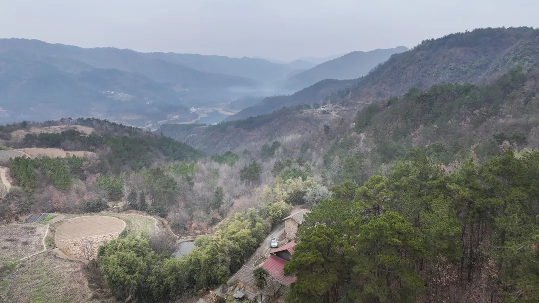 沿着张桥水库下沿的一条水泥路蜿蜒而上,青色的松树、落叶的栓皮栎相间生长,冬日的山林有着别样的美丽与宁静。