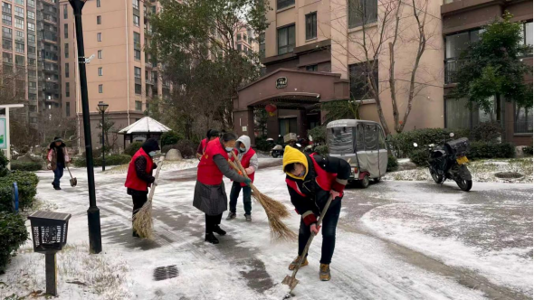 王店镇王家店社区志愿者带领热心群众清扫道路积雪 坝陵街道坝陵桥社区玫瑰园小区,818志愿服务队的队员们秉承邻里互助的初心,一大早就扛着铁锹、扫把,为邻里出行清出一条爱心通道。志愿者王女士擦着头上的汗水说:“小区里老人孩子都不少,我们辛苦点,大家出门安全点,我们就放心啦。”