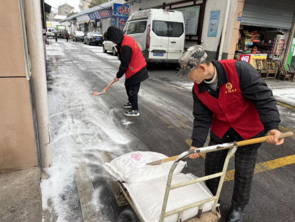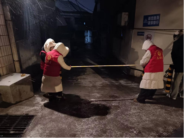 湖北日报客户端讯(通讯员 孙璨 张程程)1月19日晚,当阳市迎来了2026年的第一场雪,在漫天飞舞的雪花中,志愿者们迅速行动,用实际行动筑牢民生保障线,成为寒冬中最亮丽的一抹红。 当天晚上,玉阳街道太子桥社区志愿者连夜行动,拉起警戒线以确保居民安全,并在关键区域撒盐防止路面结冰,提前预防,保障居民出行安全。