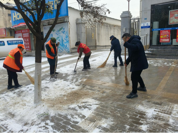 玉阳街道太子桥社区志愿者在斜坡危险路段提前拉起警戒线 1月20日一大早,各村(社区)志愿者纷纷走上街头,带领热心群众一起清扫积雪,方便市民出行。