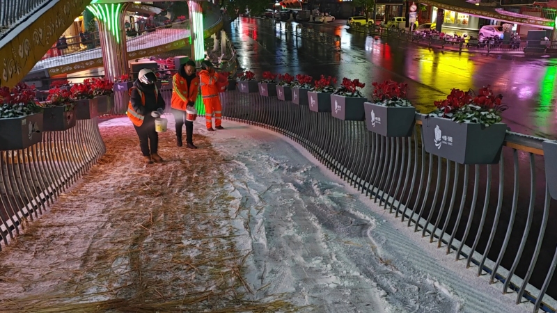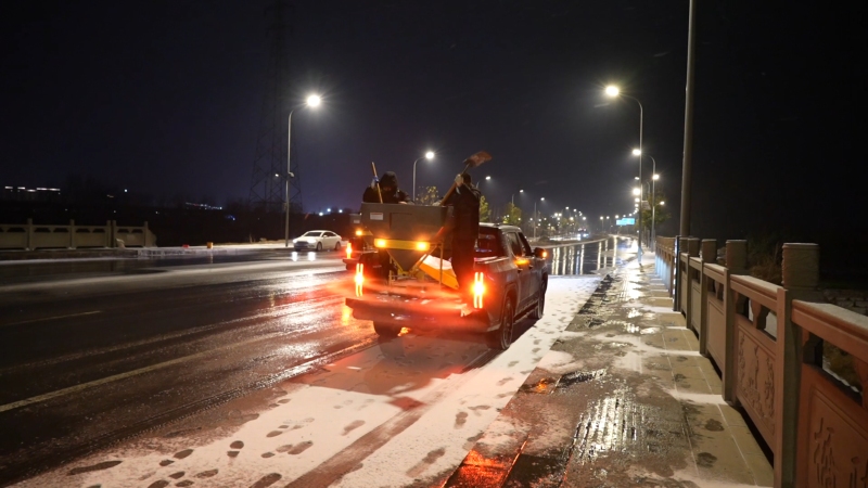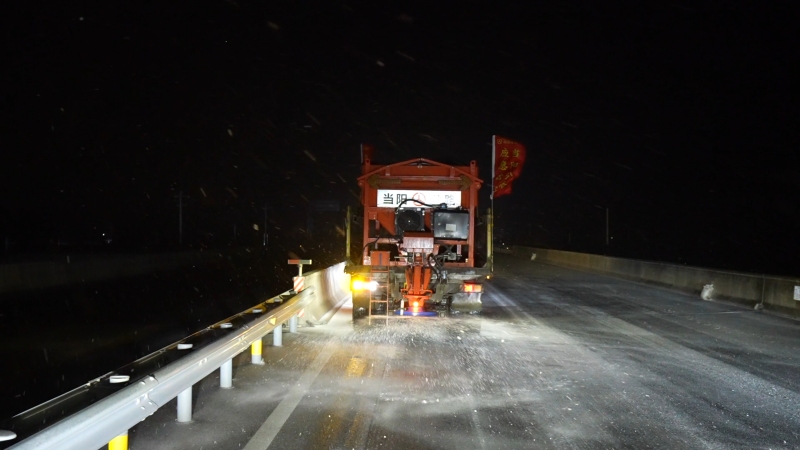 与此同时,当阳市城管局工作人员顶风冒雪,在坝陵桥、军胜桥、锦屏桥等多座桥梁,以及广家洲路、南正街天桥、体育场路等人流车流密集区域的人行道、车行道上,全面开展撒盐除冰作业,全力防范行人滑倒、车辆打滑。“截至19日晚上10点,我们共出动140余人,除雪车辆15台套,布撒除雪剂10余吨,对城区部分积雪道路进行除雪作业。接下来,我们也将时刻待命根据雪情随时出动,确保道路畅通和人民群众安全出行。”当阳市城区环境卫生服务中心主任朱全会说。