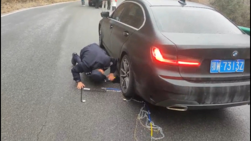 风雪中,温暖守护无处不在。在玉泉街道枣林村,有车辆因路面结冰打滑无法前行,当阳市公安局民警立即赶赴现场,帮助车主安装防滑链,护航安全出行。