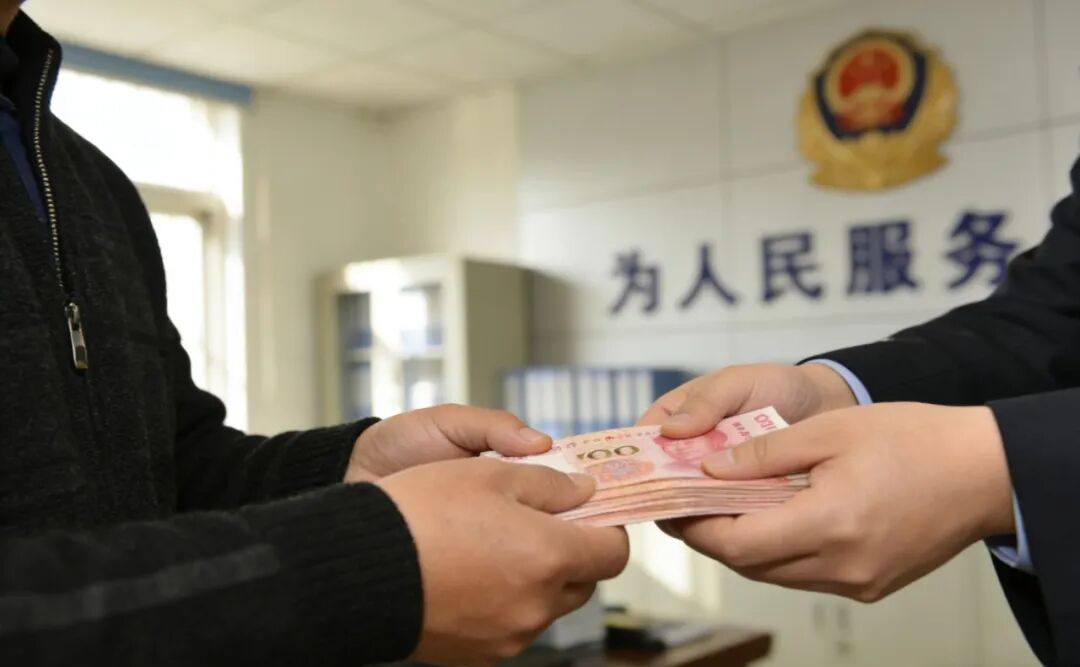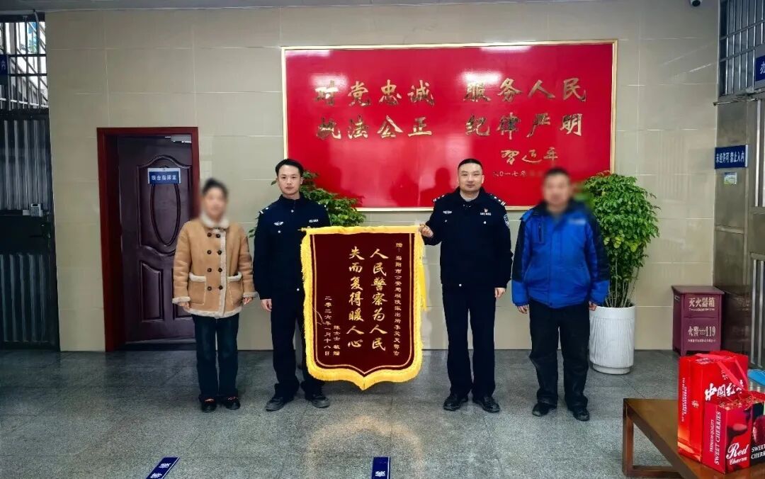 将一面写有“人民警察为人民,失而复得暖人心”的锦旗送到民警手中