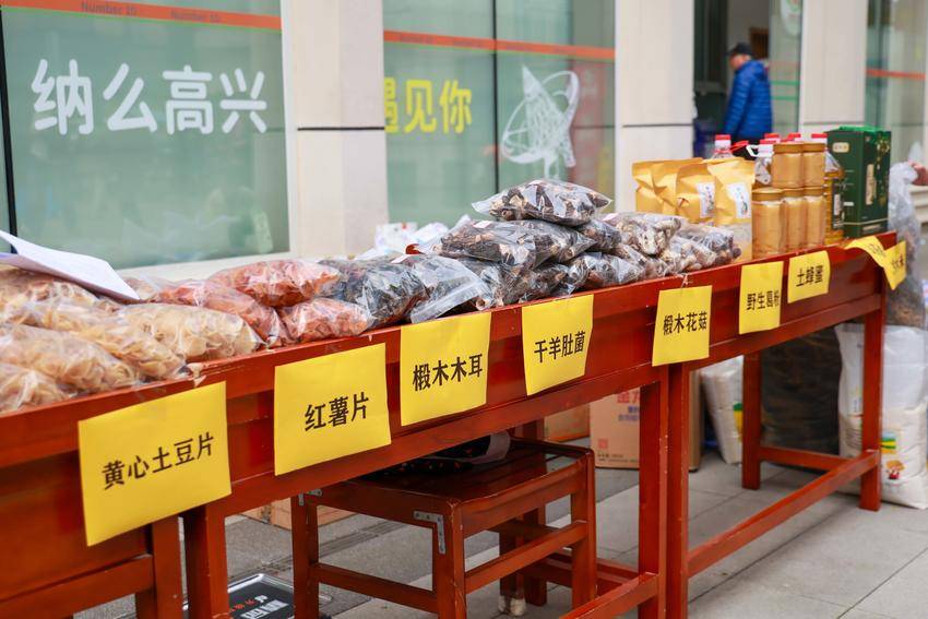活动现场人气十足、暖意融融。整齐的展台上,黄心土豆片、红薯片、椴木木耳、干羊肚菌、椴木花菇、土蜂蜜等各类原生态山货琳琅满目。这批参展农产品,全部来自村里50多户脱贫户与产业种植户,均为山上自然种养、手工晾晒、无额外添加的地道农家物产。社区居民们接踵而至,驻足挑选、细细品鉴、扫码下单,购销场面十分红火。