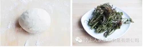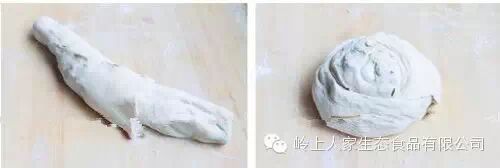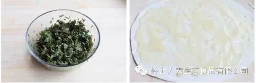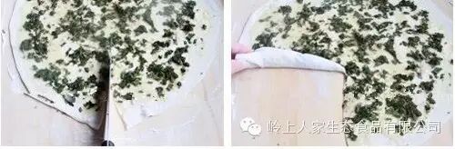 撒是香椿末、椒盐,切开一刀,从一边卷成起,压实擀开