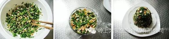 加入盐、香油和香醋,搅拌均匀 拿一个水杯,铺上保鲜膜,把拌好的凉菜放入杯中,压实