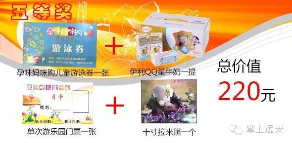 五等奖五十名:价值60元游泳券一张+价值40元的伊利QQ星牛奶一提+价值20元的儿童乐园单次门票一张+价值100元的十寸拉米一个 总价值:220元
