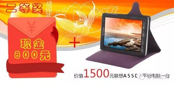 二等奖一名:800元现金+价值1500元联想平板电脑一台。